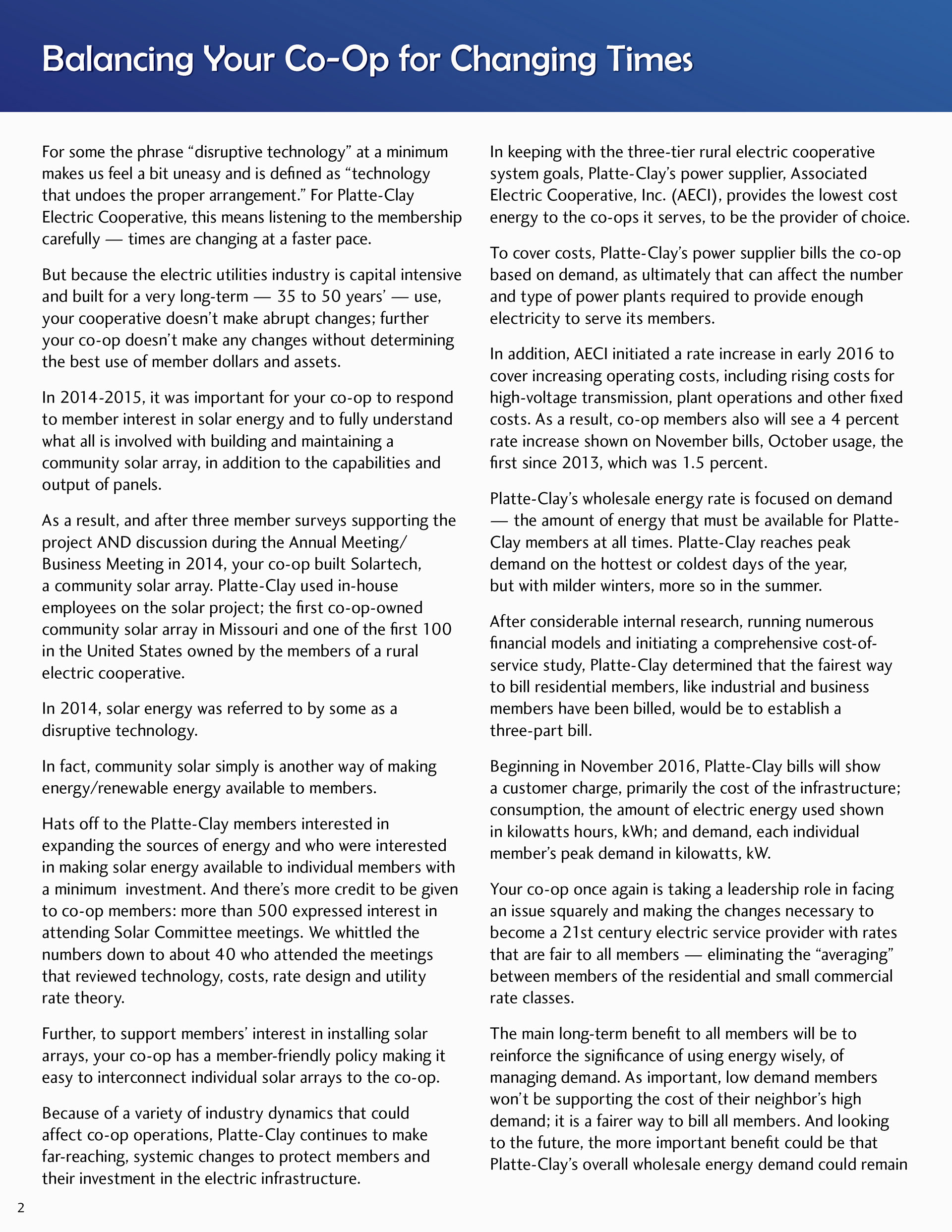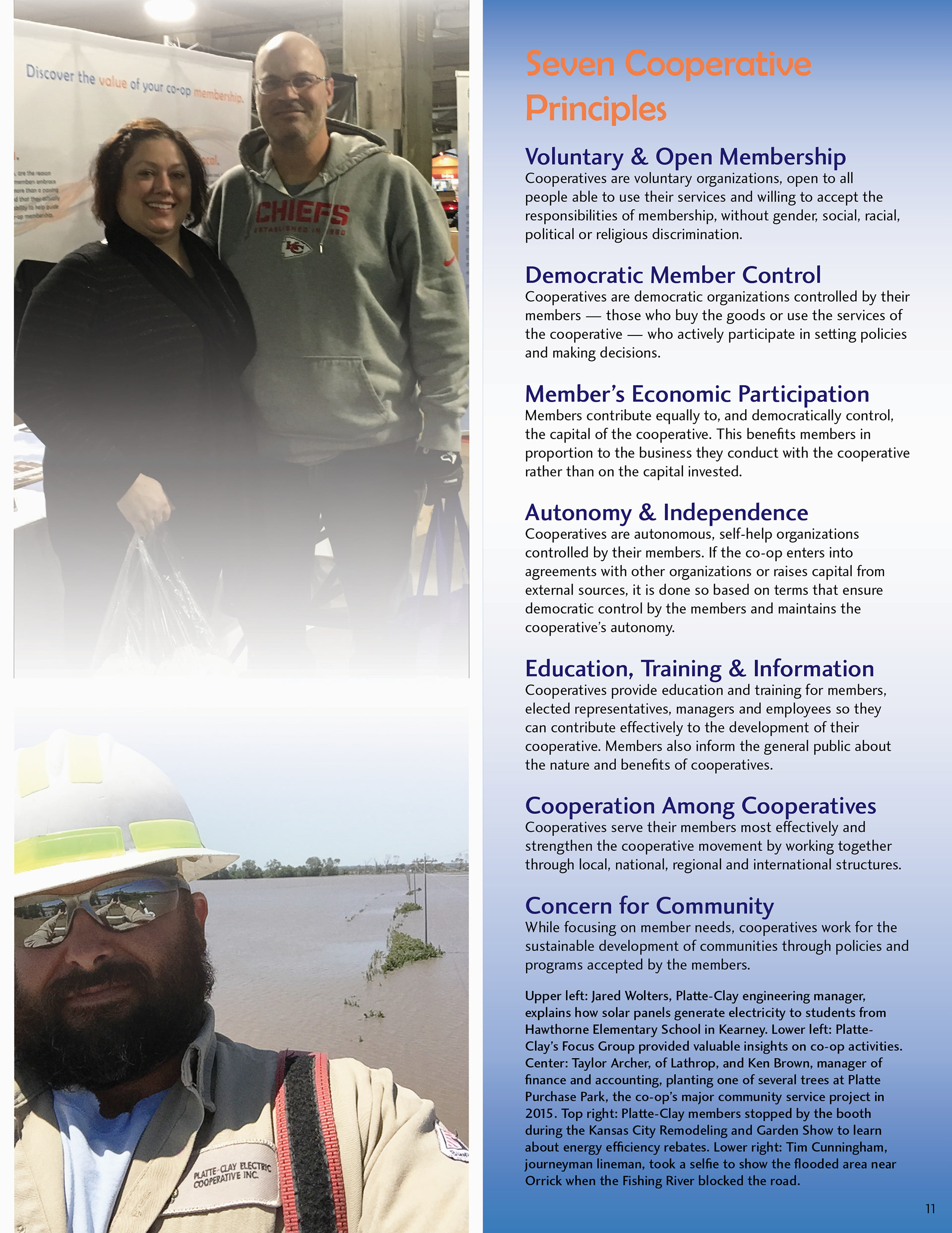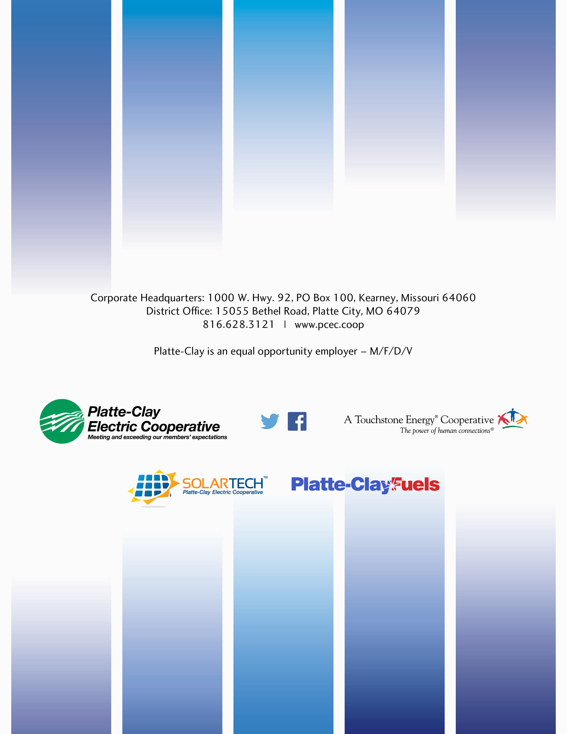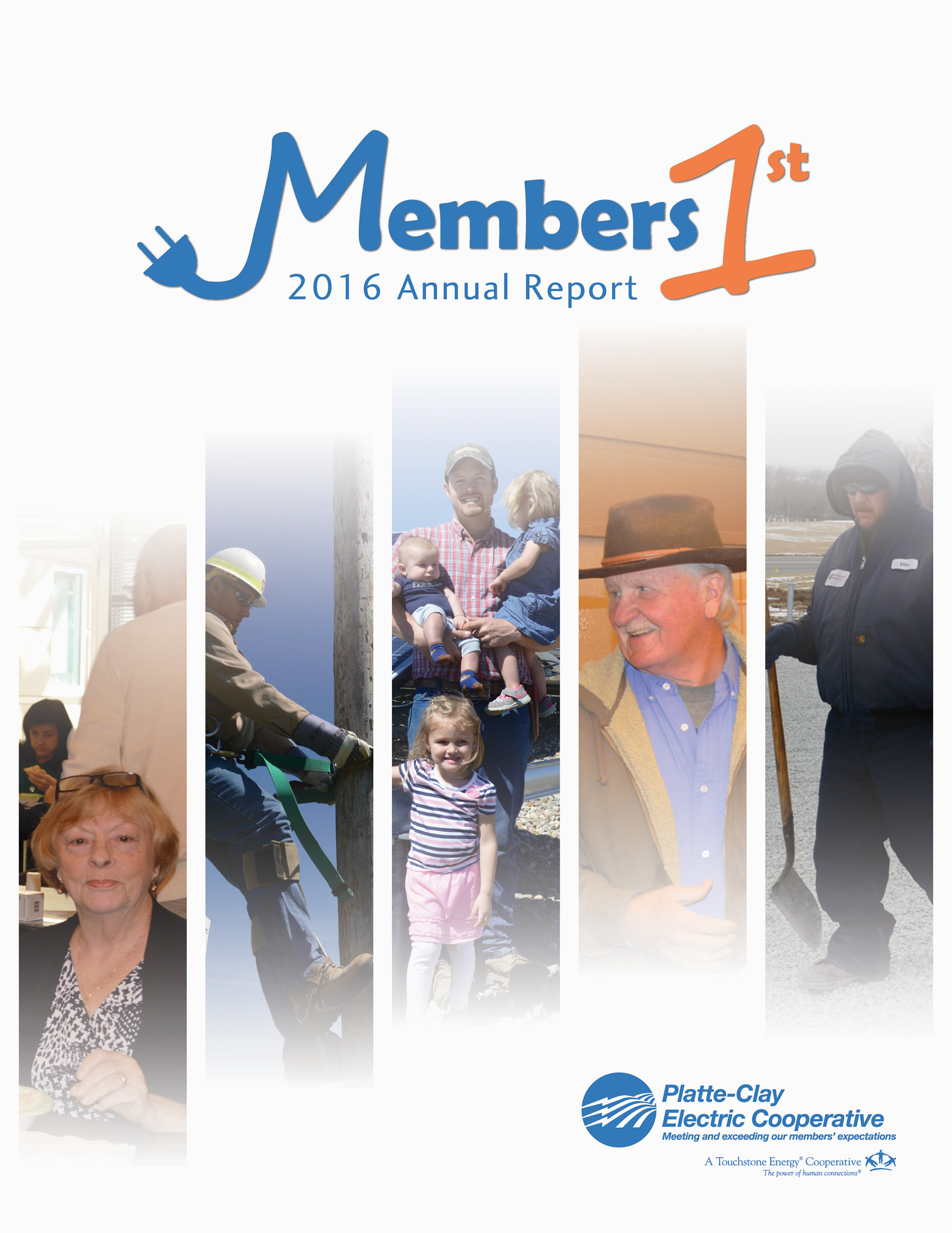 The 2016 Platte-Clay Electric Cooperative annual report was designed around the Members 1st logo. Rather than replicate the dated logo in various forms, the color worked to tie the logo into a design for a tech-forward, community-driven energy company. Gradients and tints soften the high-contrast color scheme, lending depth to otherwise flat illustrations and patterns.
