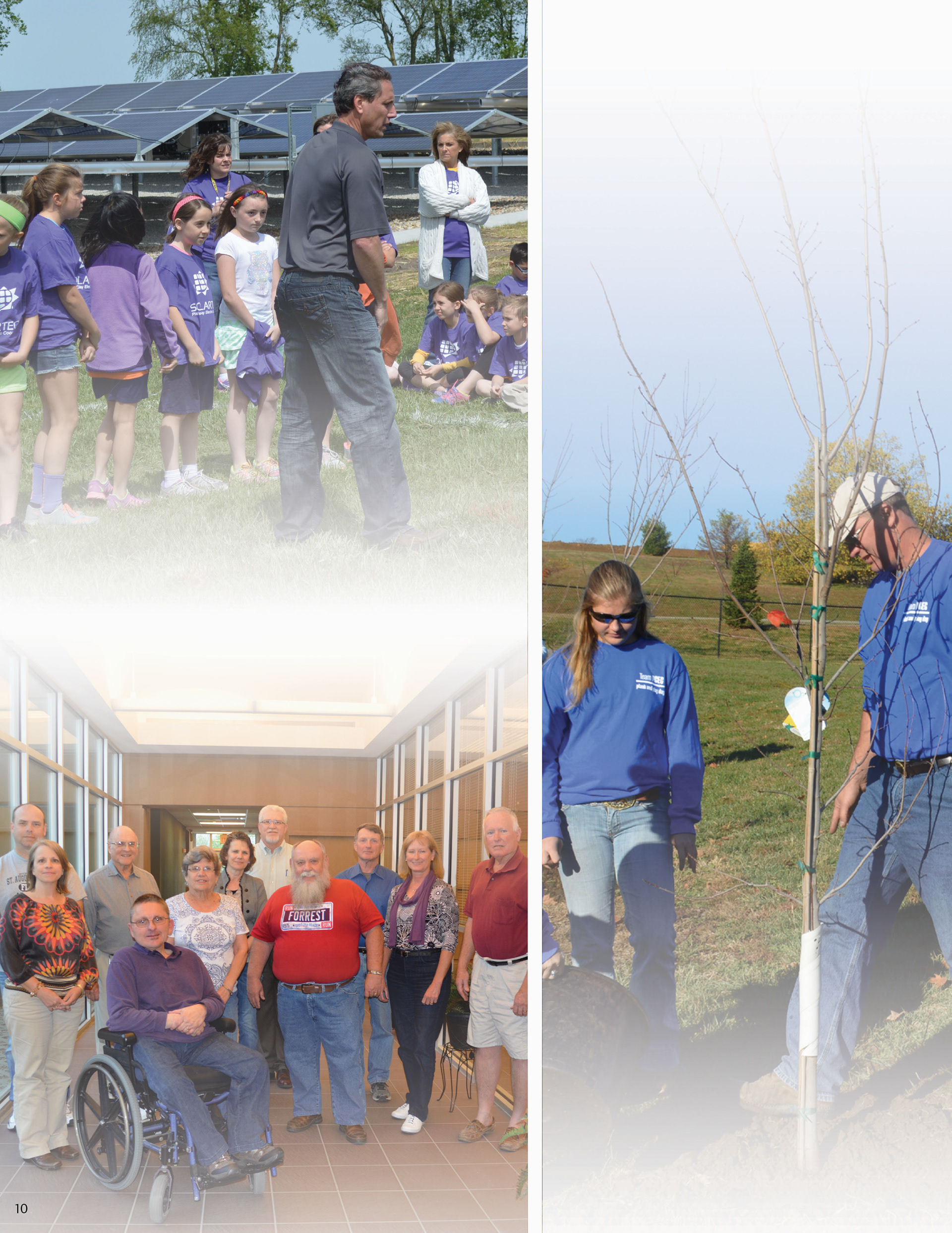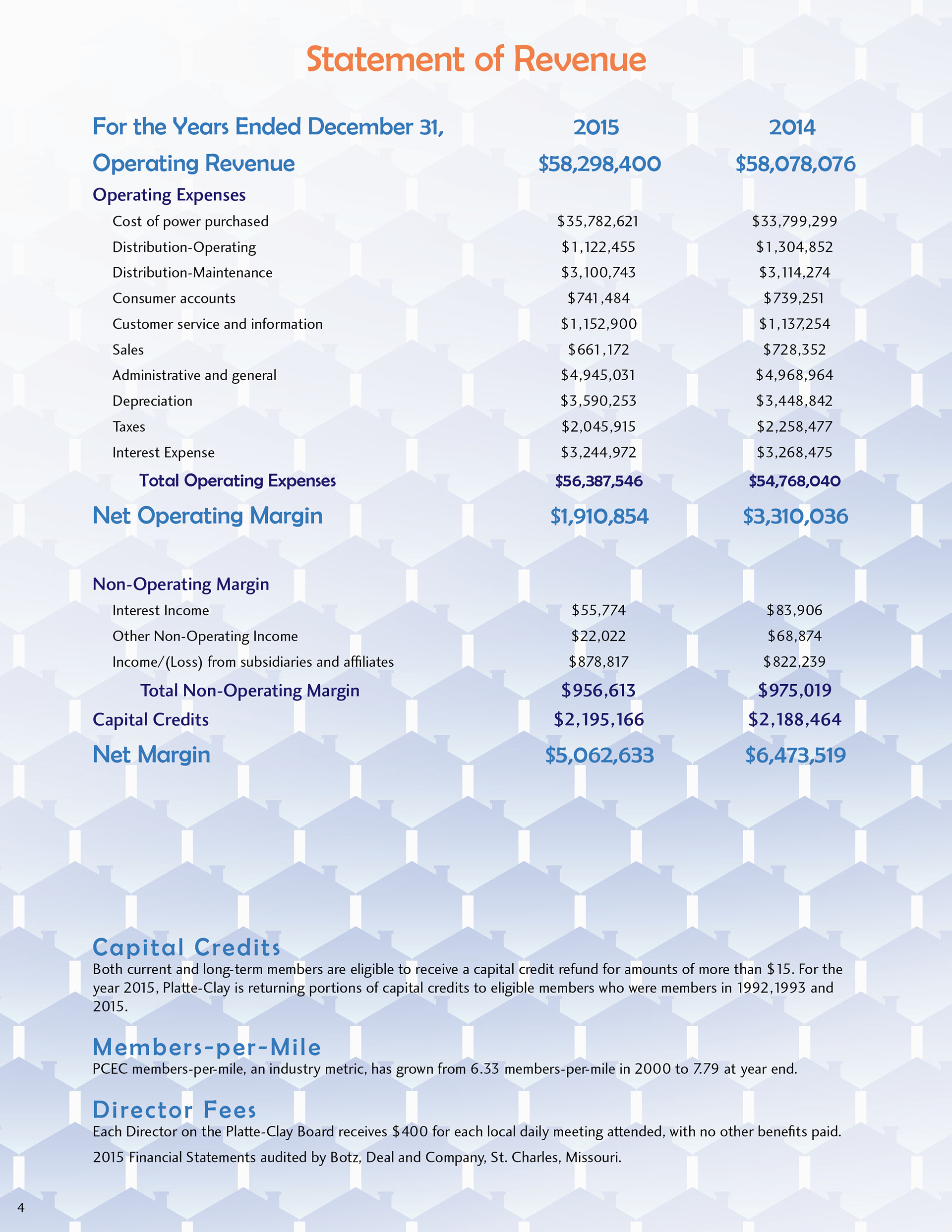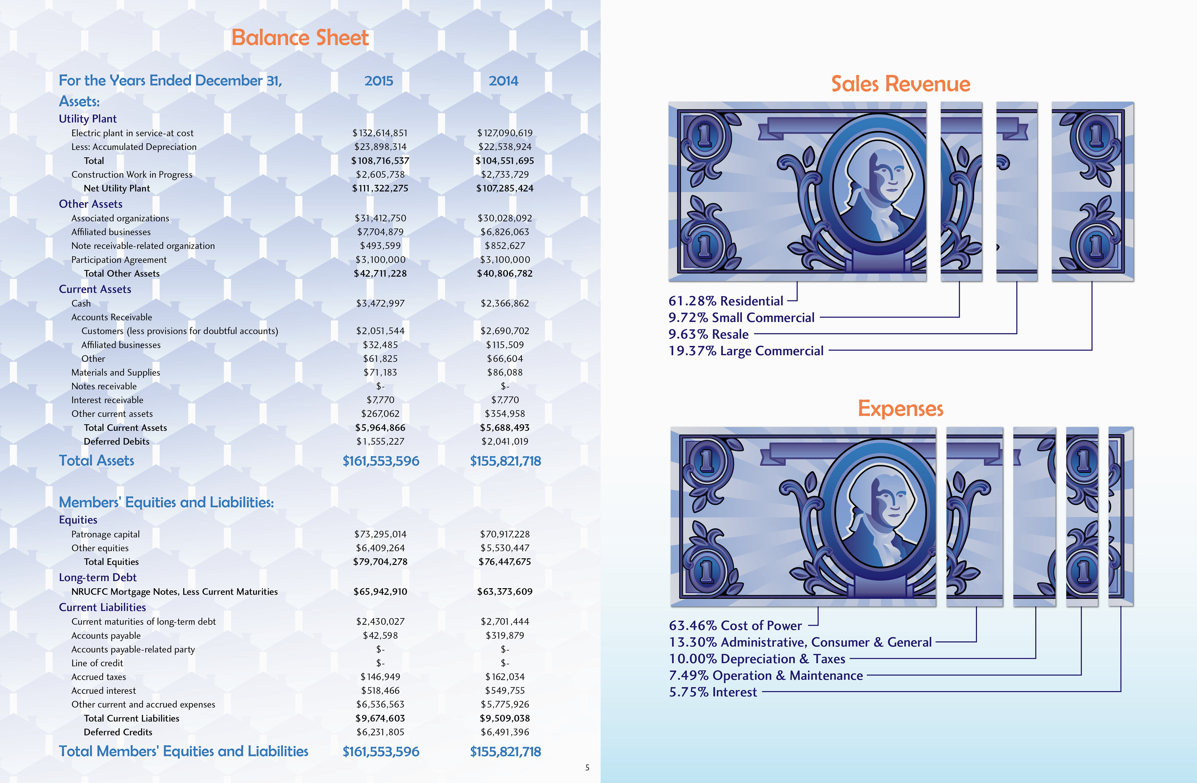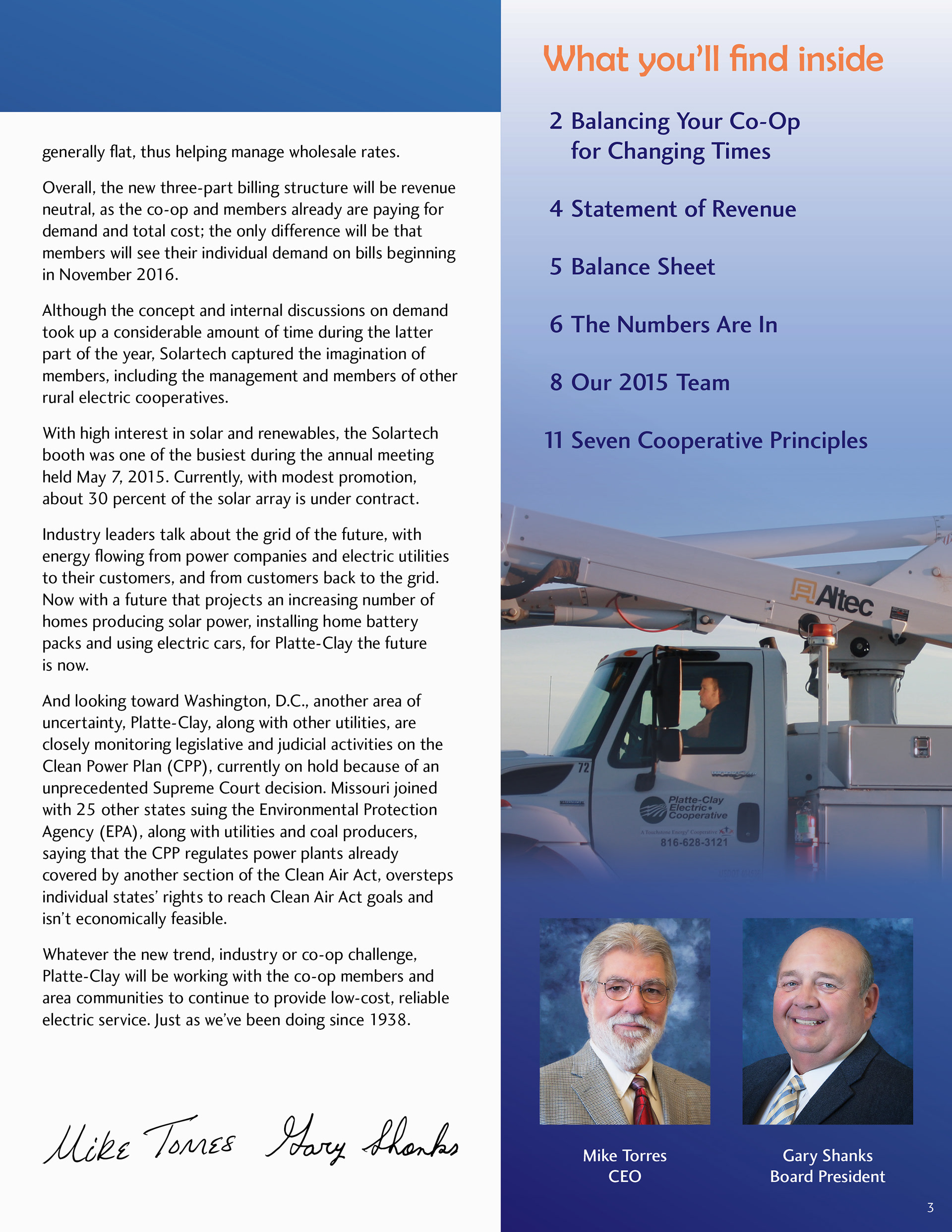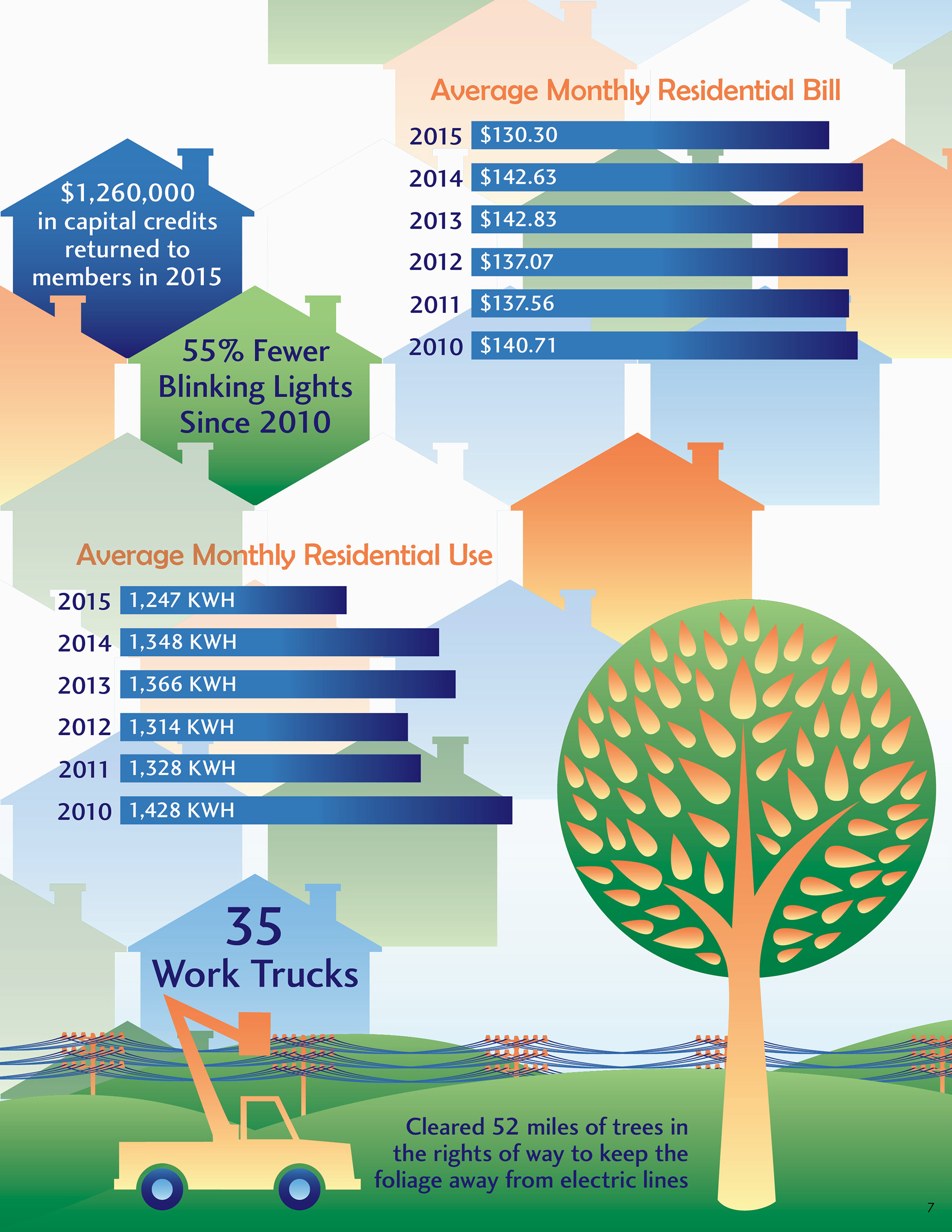The 2016 Platte-Clay Electric Cooperative annual report was designed around the Members 1st logo. Rather than replicate the dated logo in various forms, the color worked to tie the logo into a design for a tech-forward, community-driven energy company. Gradients and tints soften the high-contrast color scheme, lending depth to otherwise flat illustrations and patterns.