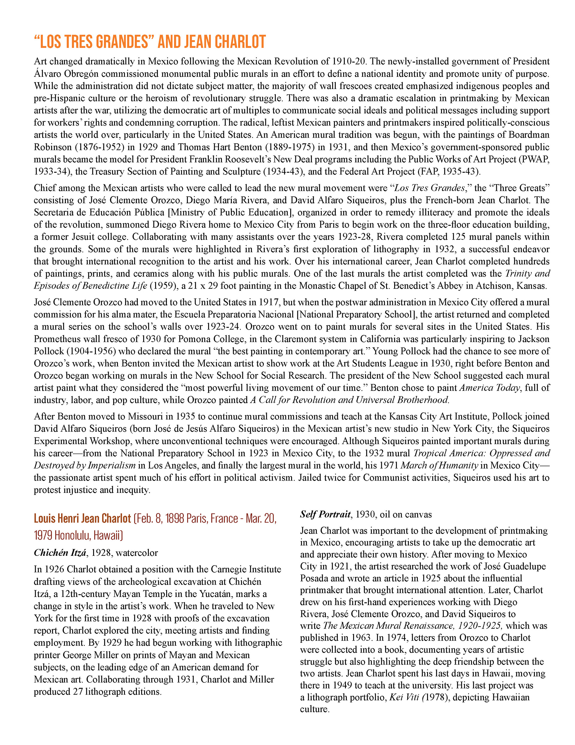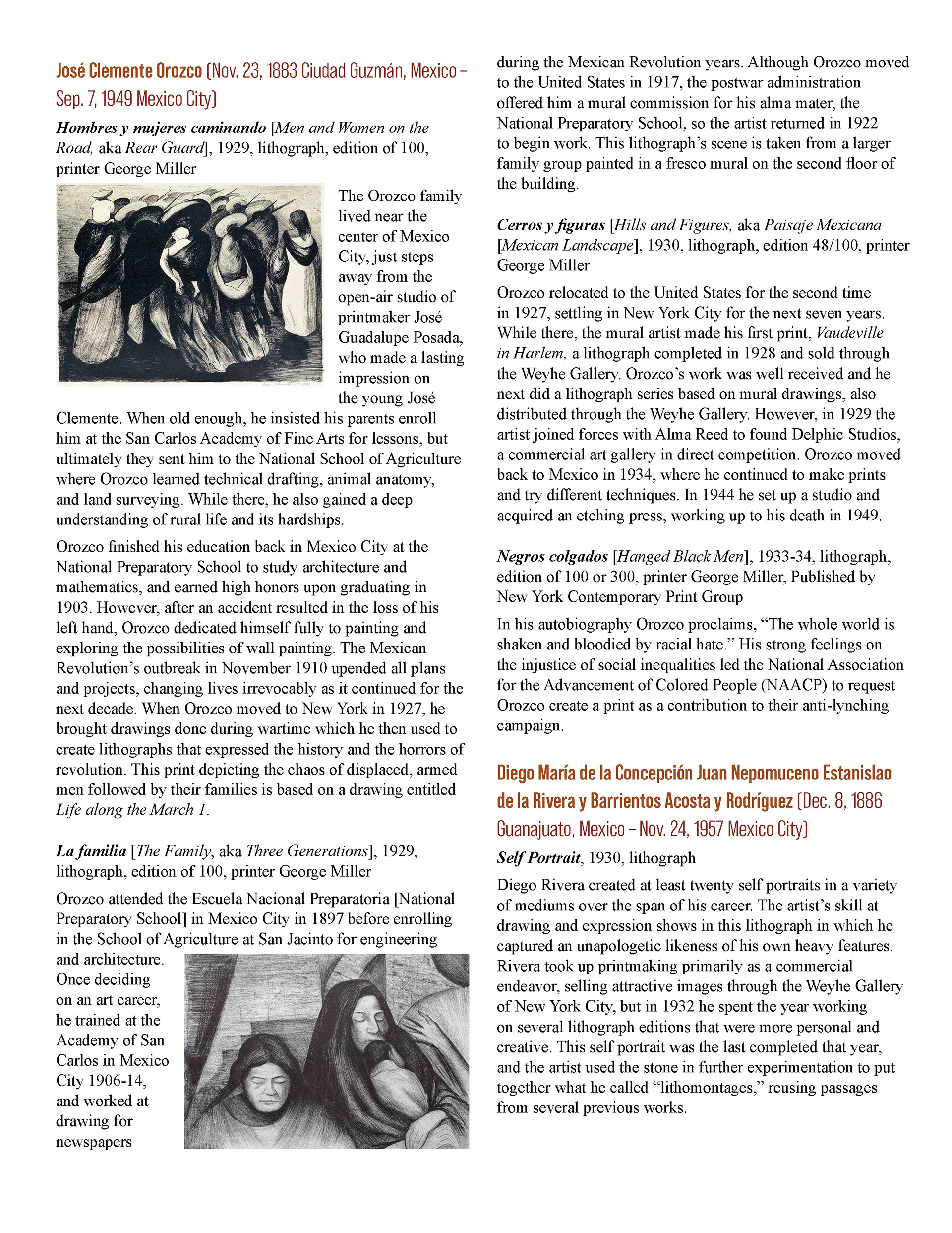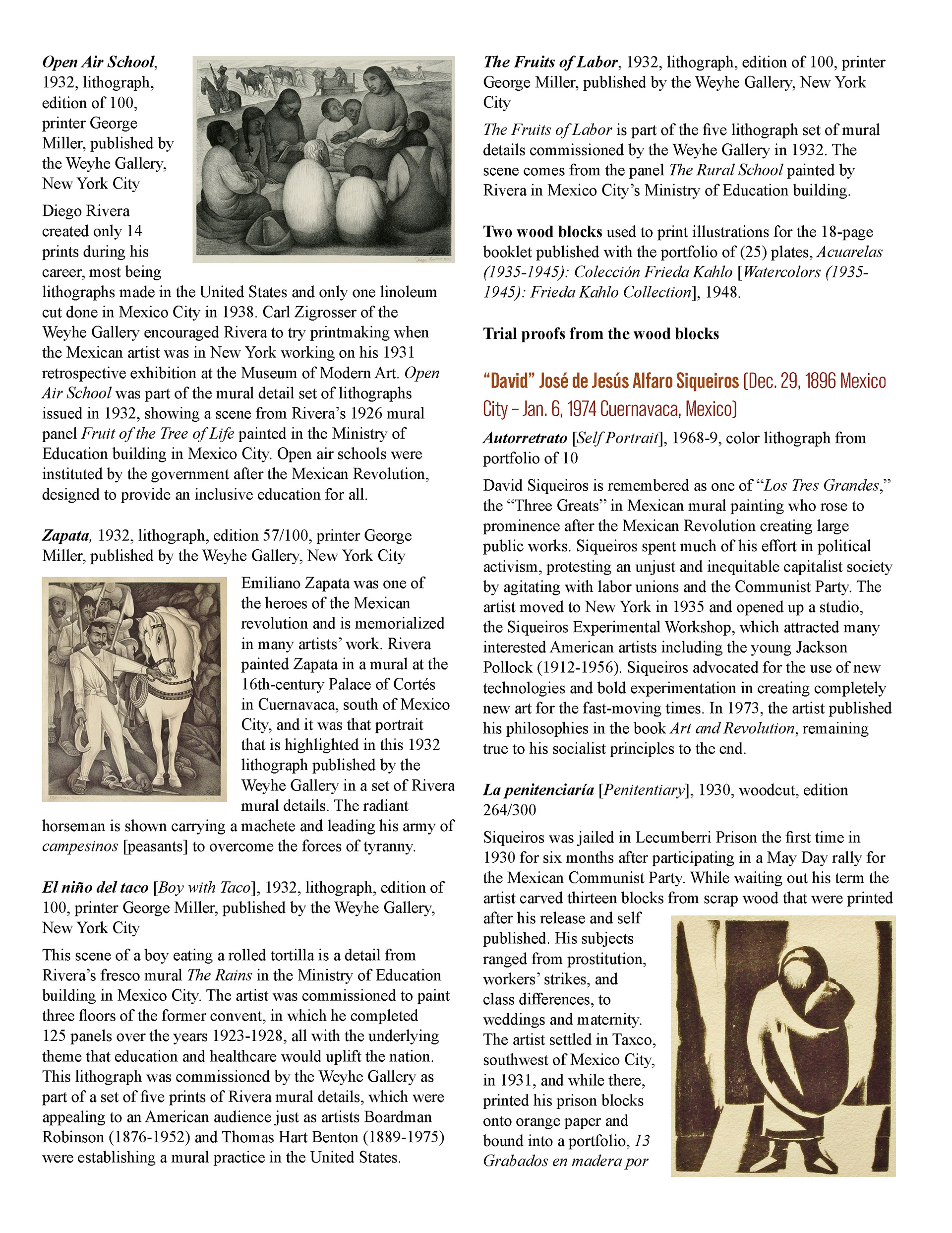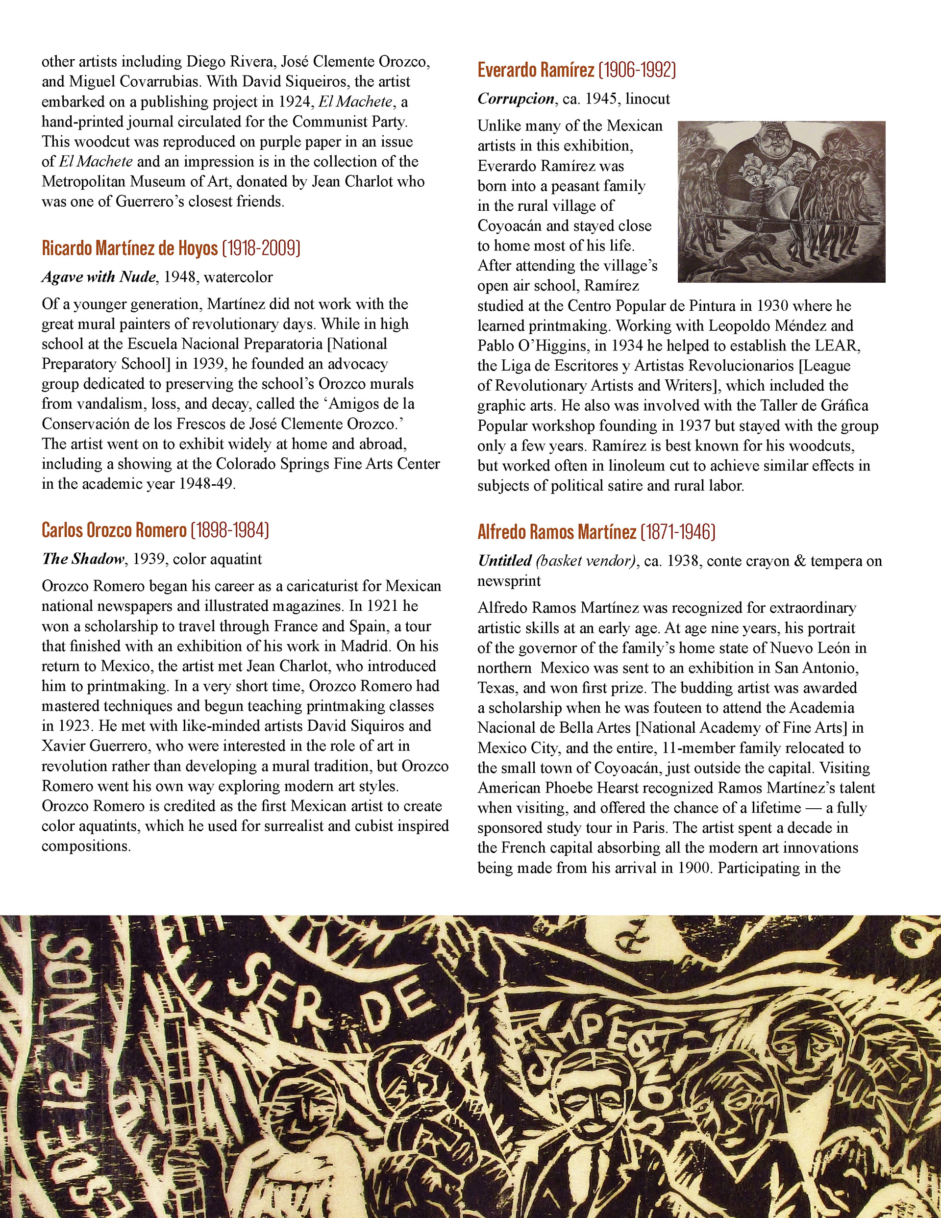 This booklet is designed as a companion piece for a traveling art exhibit. An expanded version will be completed at a later date for use by the Birger Sandzen Memorial Gallery, exhibiting the same artwork. Featured artwork provides a powerful portrait of the Mexican working class during times of revolution and poverty. The layout of this version of the booklet is designed to save space. The layout incorporates the images within the text without captioning, utilizing the full width of the page. The use of single column or split column layouts provides distinction between introductory text about the movement and text about the artists and their art. The inside covers provide bookends of expanded artwork detail, taking the place of an elaborate introduction and conclusion. The art speaks for itself.
