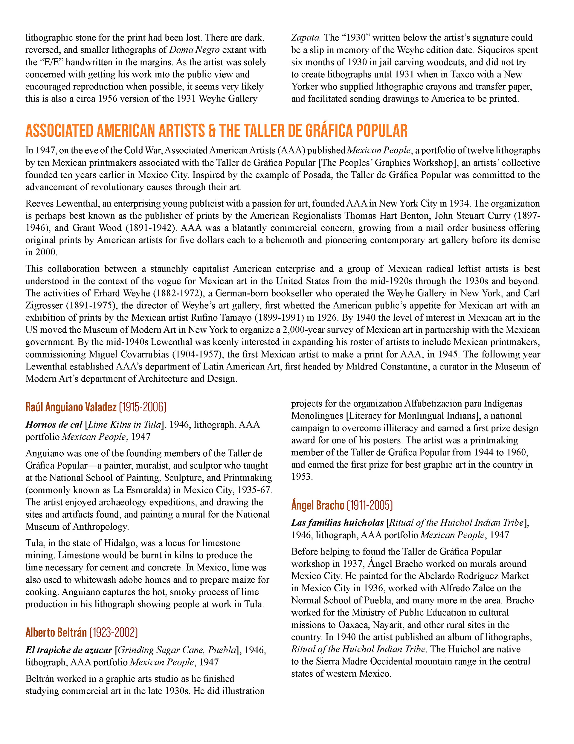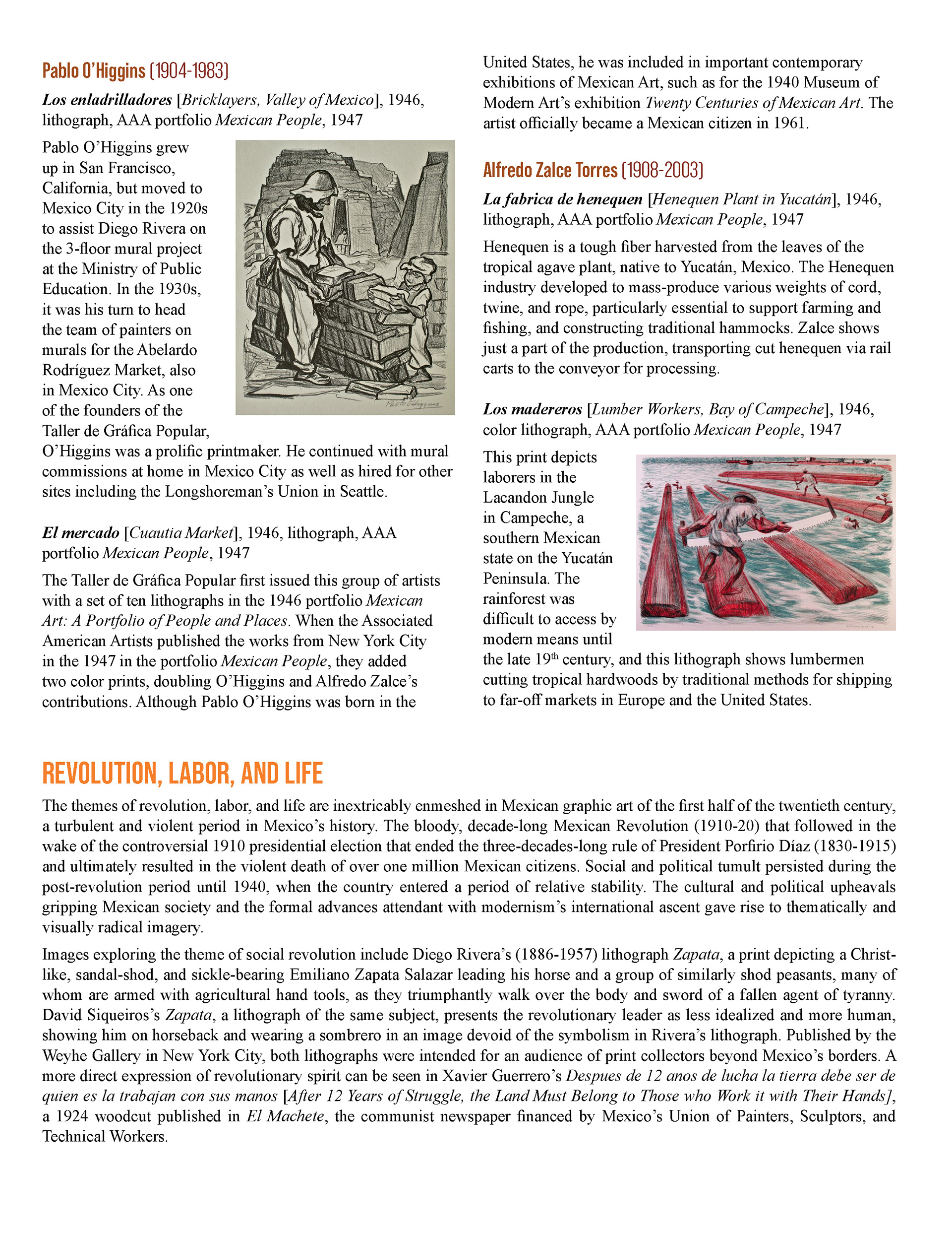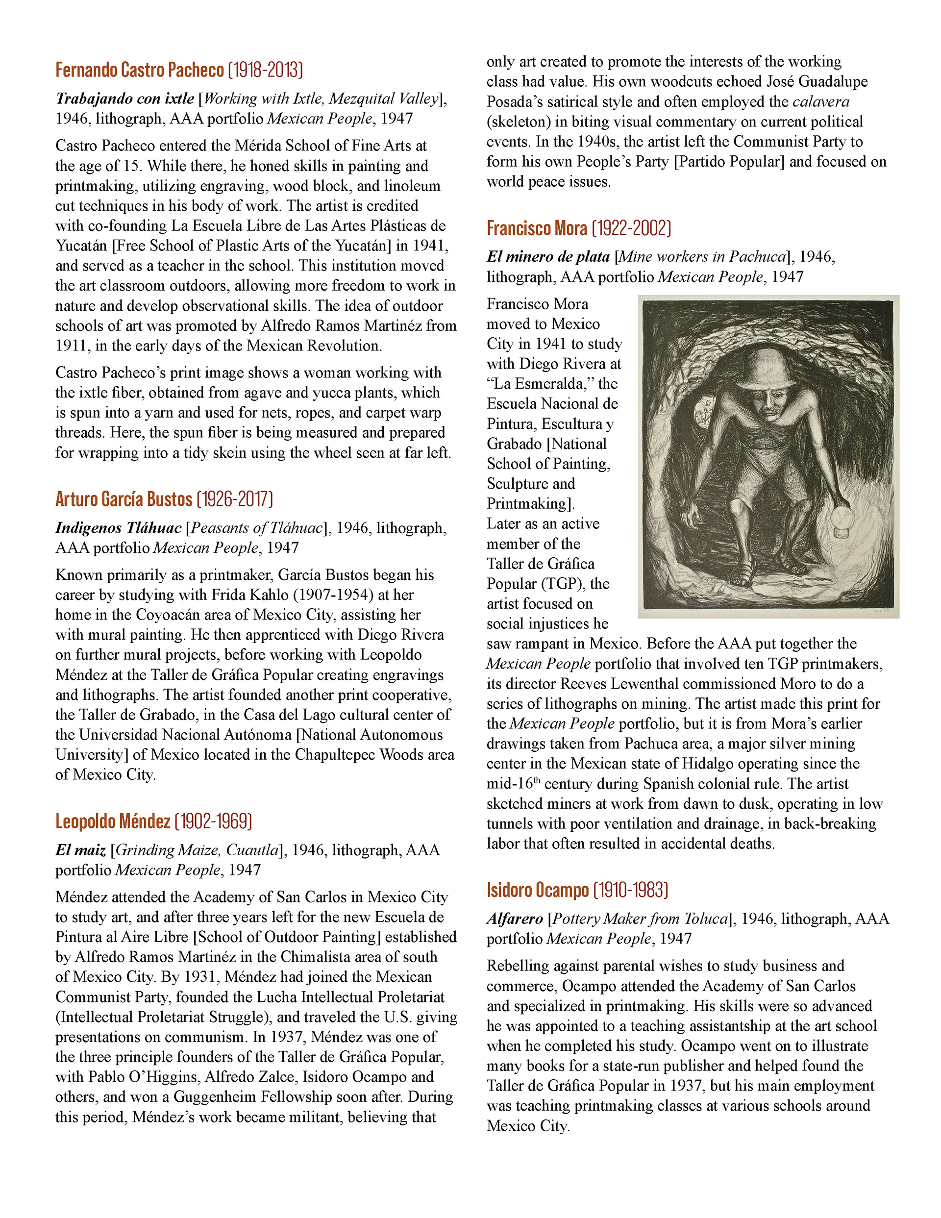 This booklet is designed as a companion piece for a traveling art exhibit. An expanded version will be completed at a later date for use by the Birger Sandzen Memorial Gallery, exhibiting the same artwork. Featured artwork provides a powerful portrait of the Mexican working class during times of revolution and poverty. The layout of this version of the booklet is designed to save space. The layout incorporates the images within the text without captioning, utilizing the full width of the page. The use of single column or split column layouts provides distinction between introductory text about the movement and text about the artists and their art. The inside covers provide bookends of expanded artwork detail, taking the place of an elaborate introduction and conclusion. The art speaks for itself.