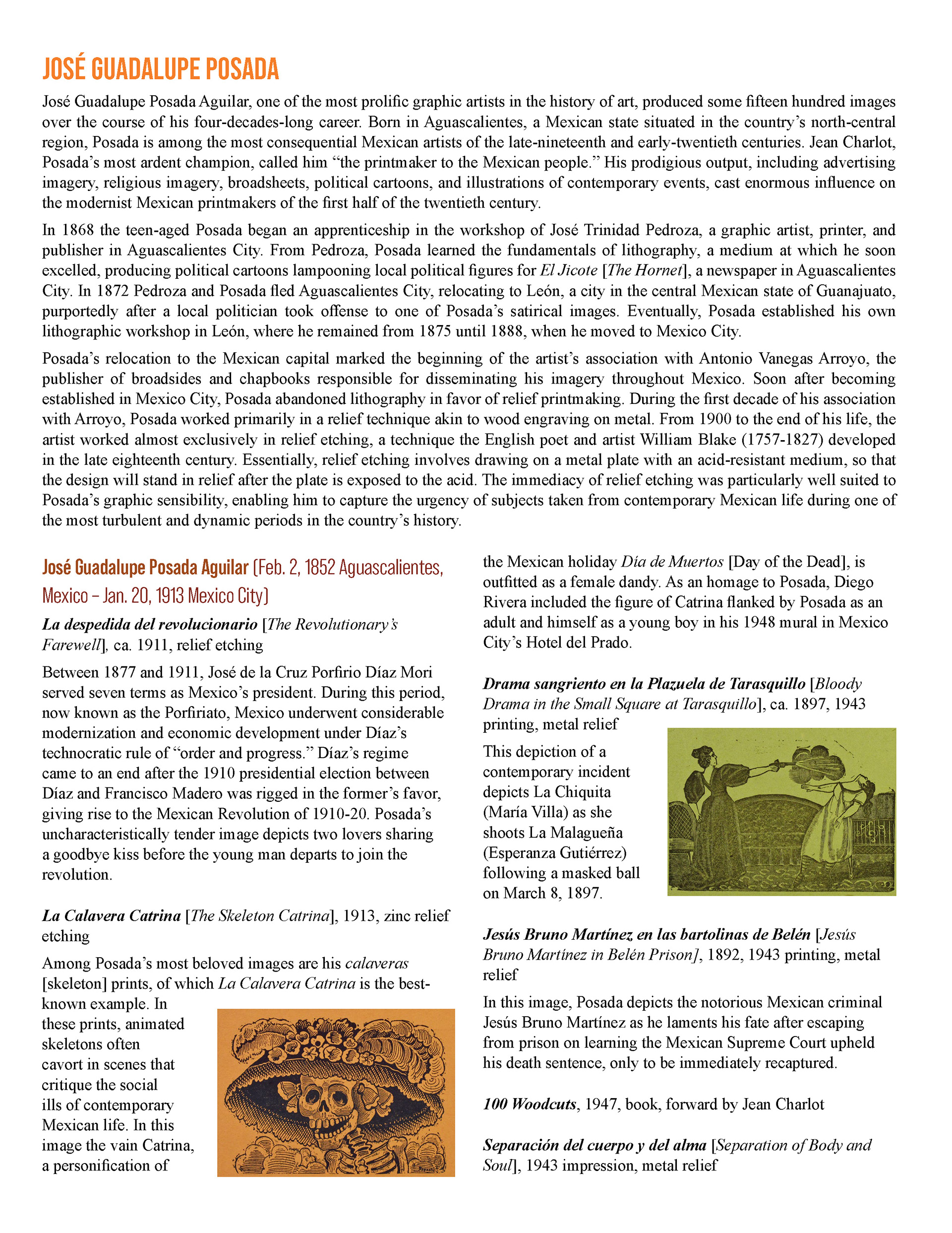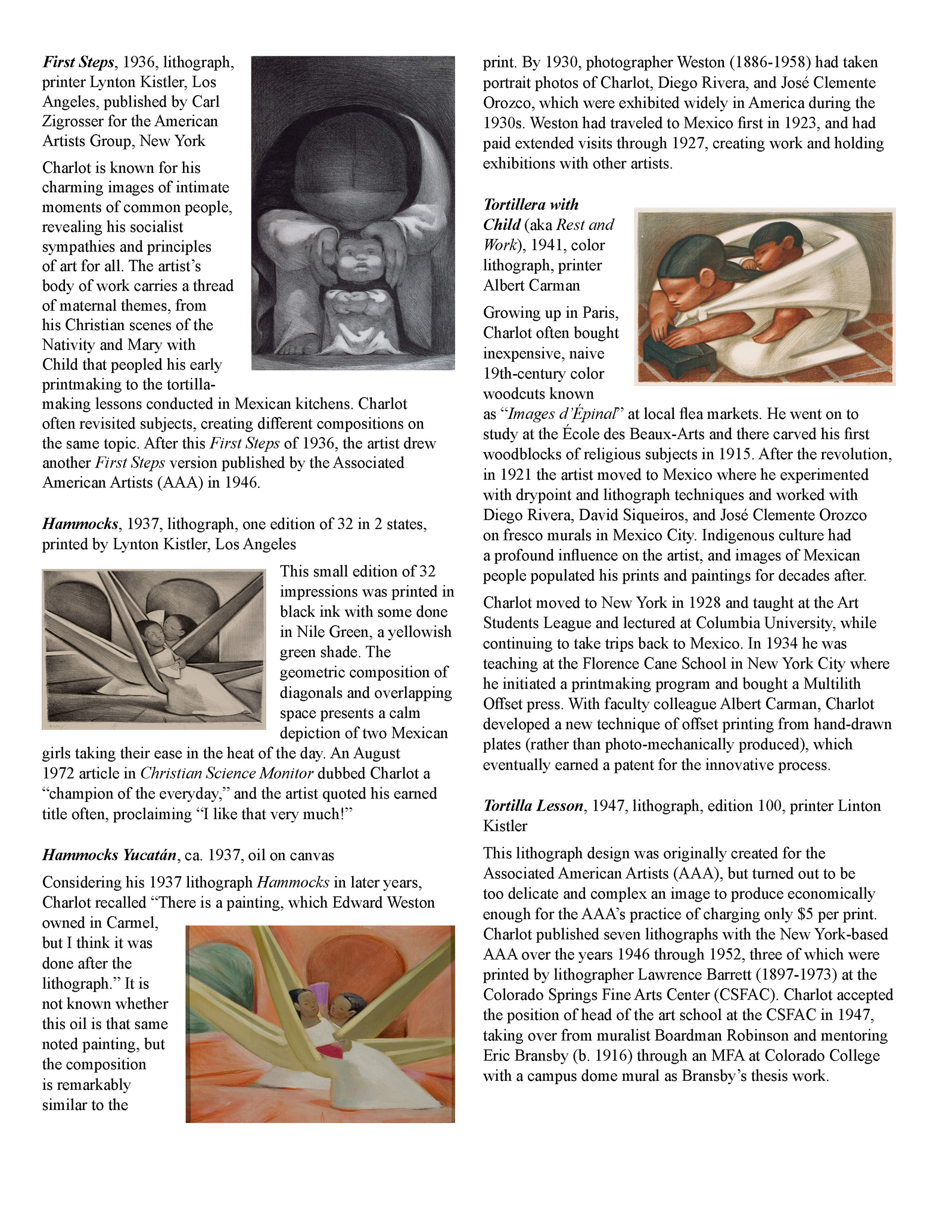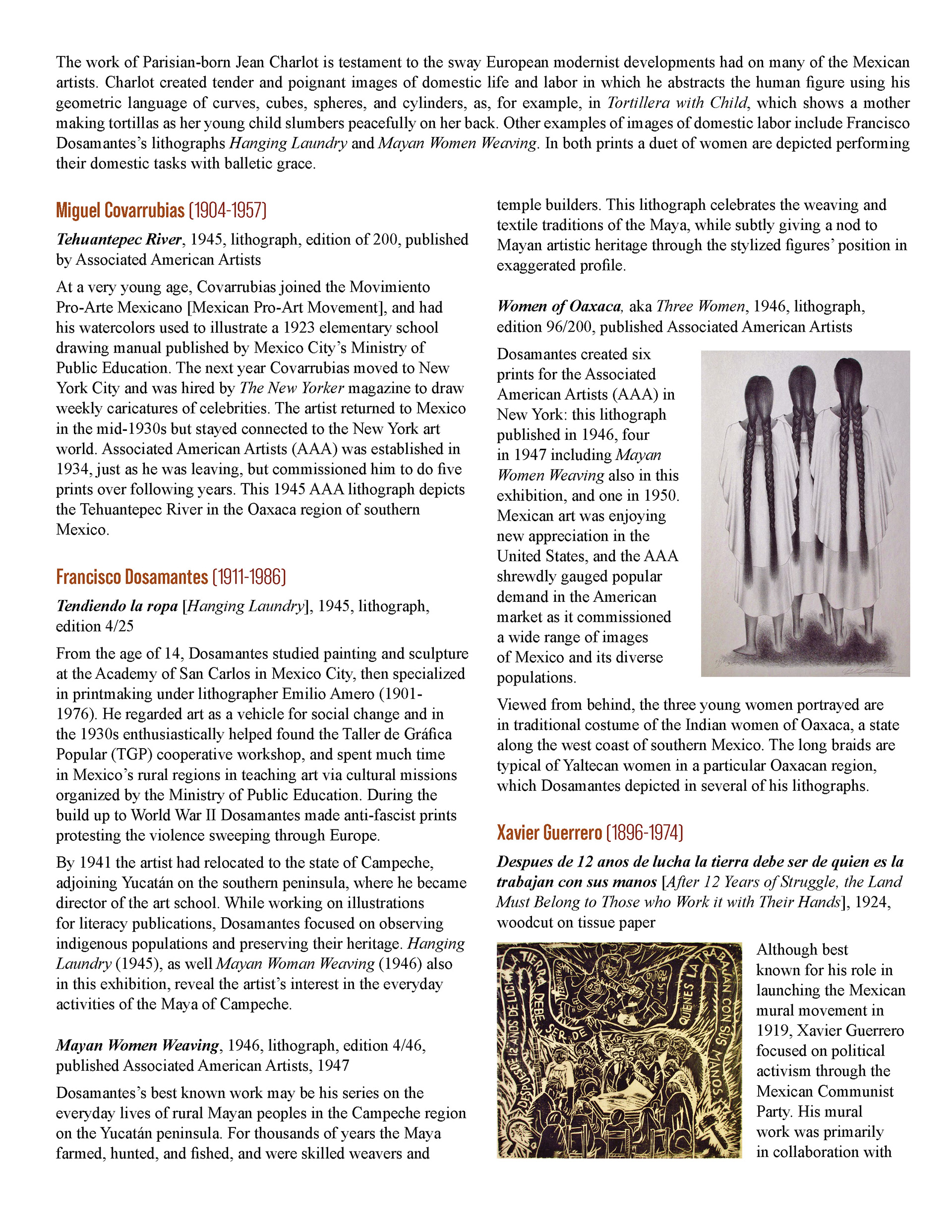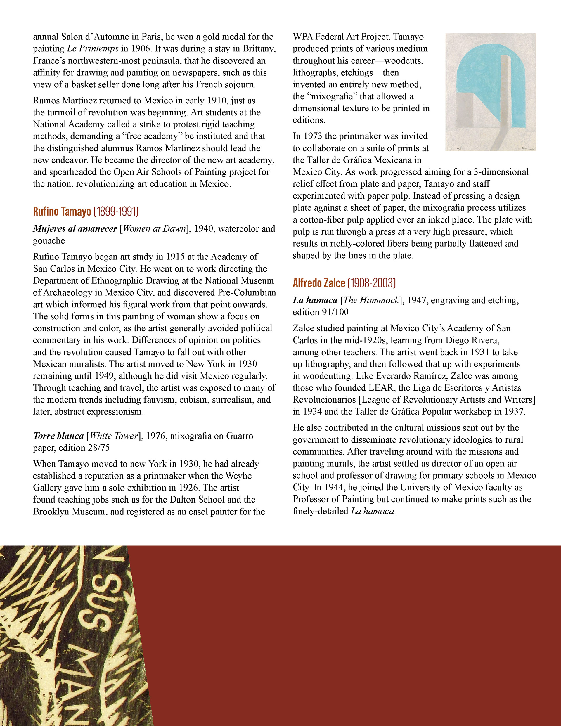 This booklet is designed as a companion piece for a traveling art exhibit. An expanded version will be completed at a later date for use by the Birger Sandzen Memorial Gallery, exhibiting the same artwork. Featured artwork provides a powerful portrait of the Mexican working class during times of revolution and poverty. The layout of this version of the booklet is designed to save space. The layout incorporates the images within the text without captioning, utilizing the full width of the page. The use of single column or split column layouts provides distinction between introductory text about the movement and text about the artists and their art. The inside covers provide bookends of expanded artwork detail, taking the place of an elaborate introduction and conclusion. The art speaks for itself.